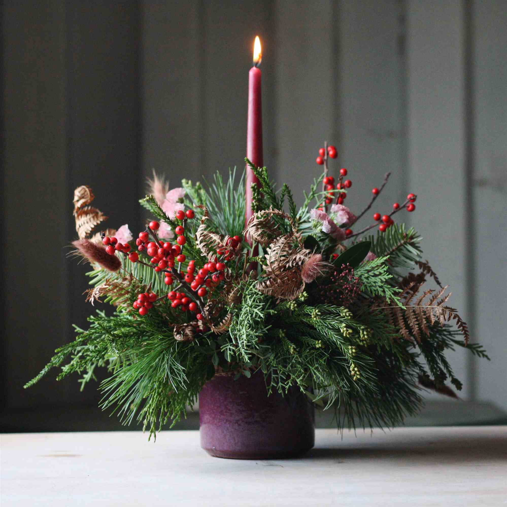 AVAILABLE FROM 15TH DECFestive foliage, berries and dried flowers are arranged around a burgundy candle, presented in a glazed ceramic pot. We've chosen a beautiful selection of fresh and dried items, designed to last the whole festive period.