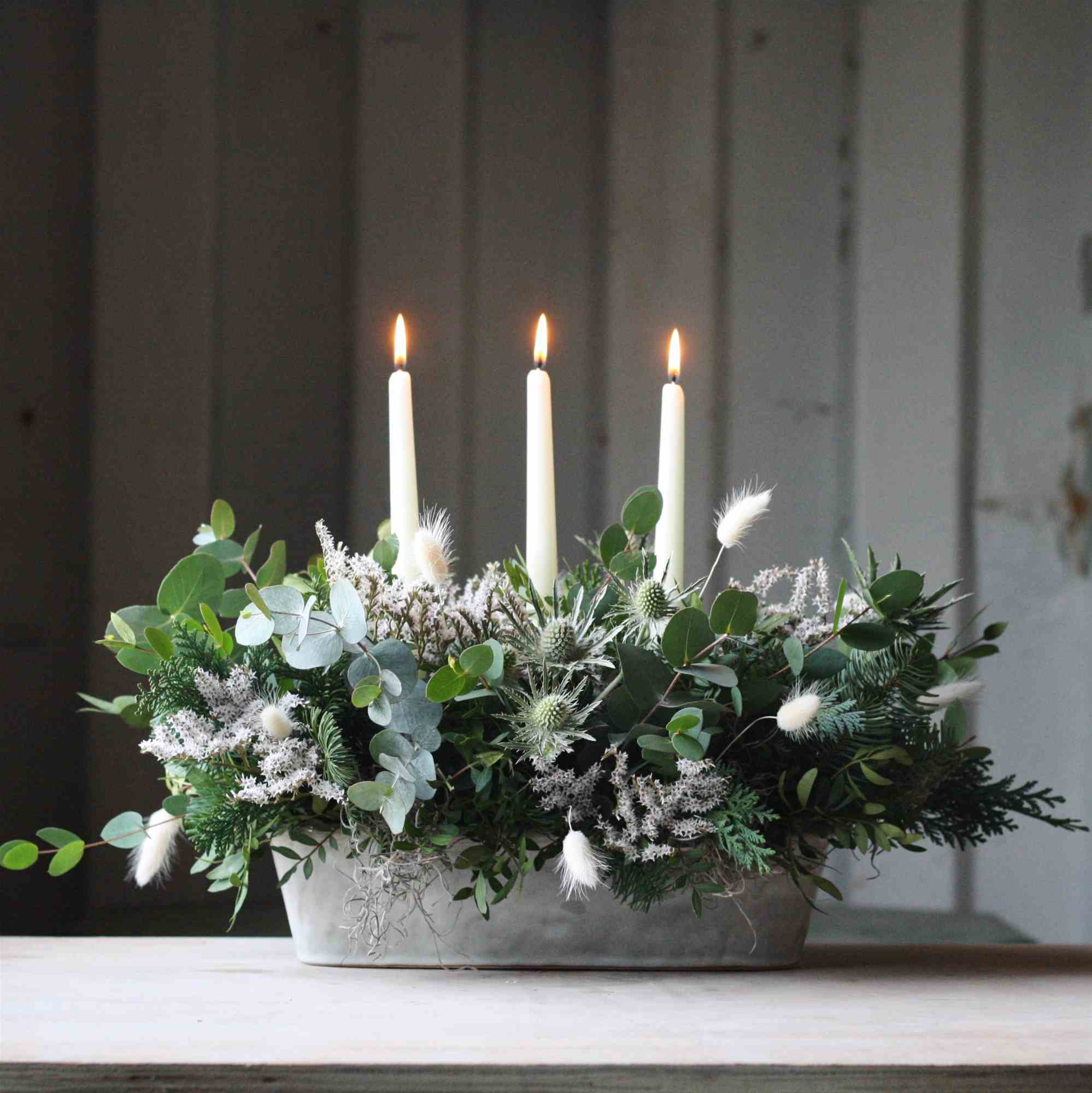 Frosty festive foliage, thistles and dried flowers are arranged around 3 ivory candles, presented in a glazed ceramic trough. We've chosen a beautiful selection of fresh and dried items, designed to last the whole festive period.