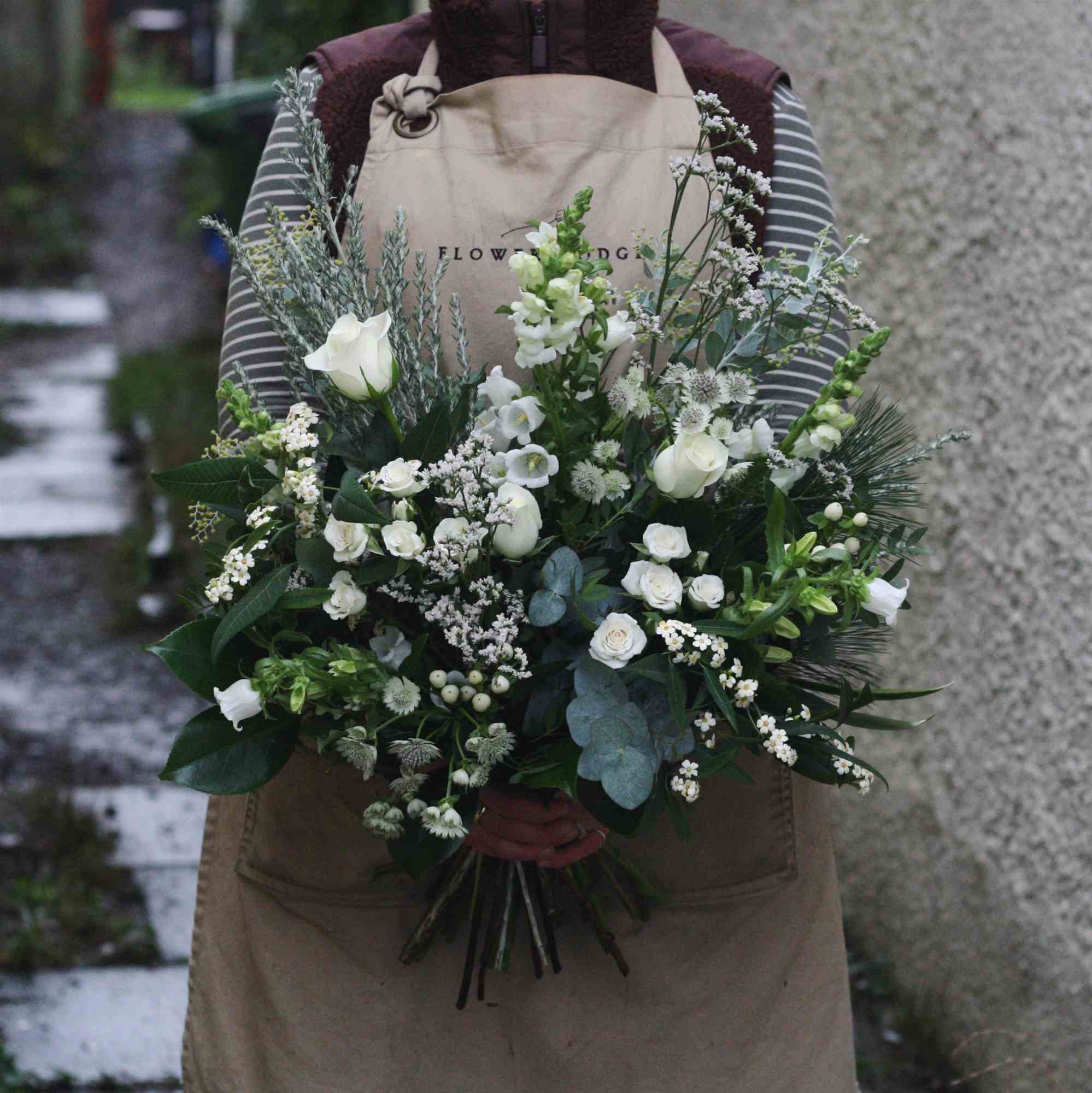A calm and considered winter bouquet consisting of creamy florals and fragrant festive foliage. Hand tied in our signature natural style, presented in a glass jar with satin bow. Gift wrapped for any occasion this festive season.